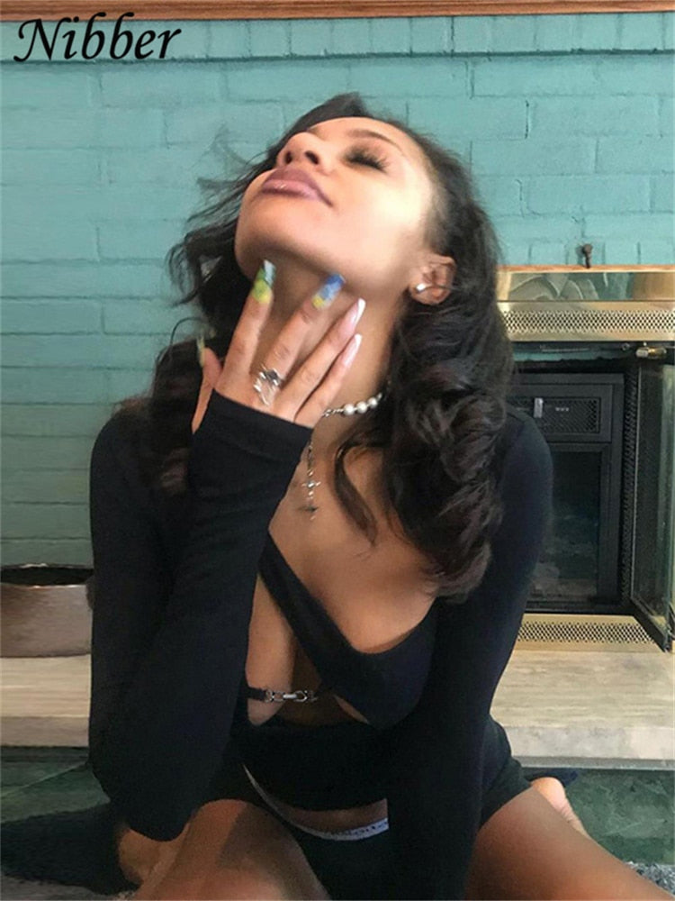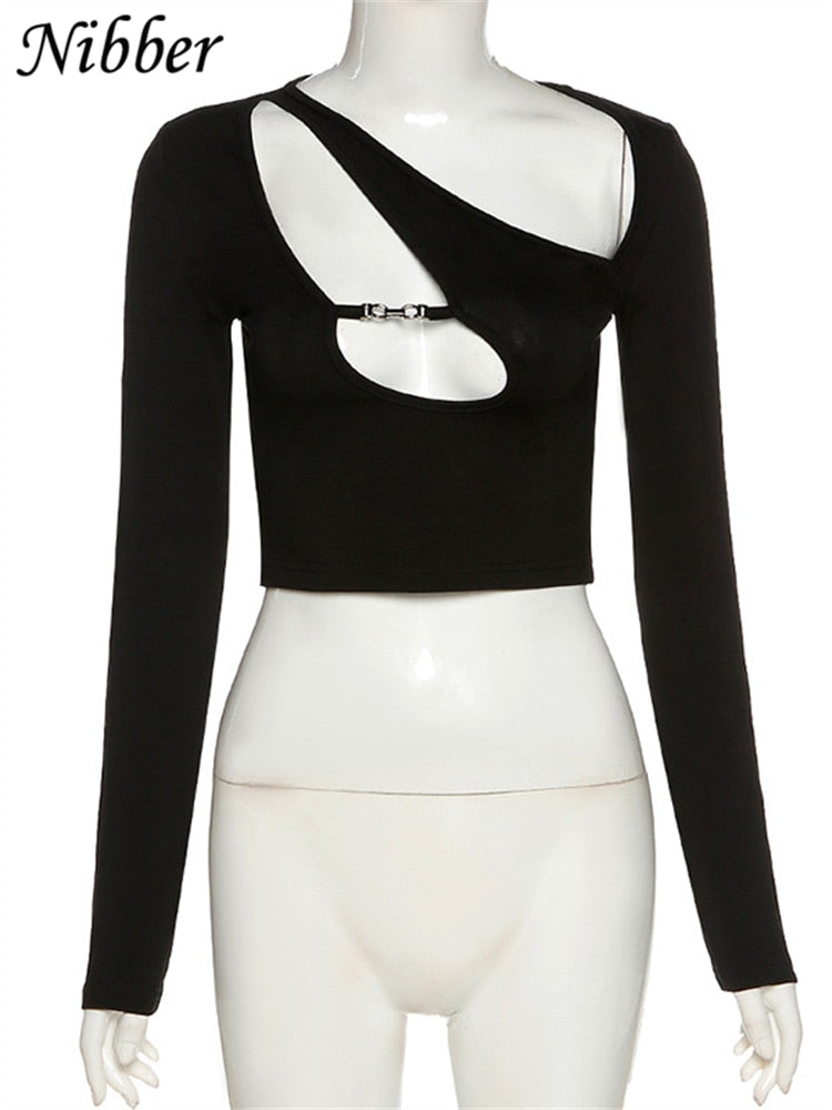 Nibber Hollow Out Crop Top Y2K Punk Tee Shirts For Women Asymmetrical Gothic Streetwear 2021 Spring Sexy Skinny Club Clothes Top
